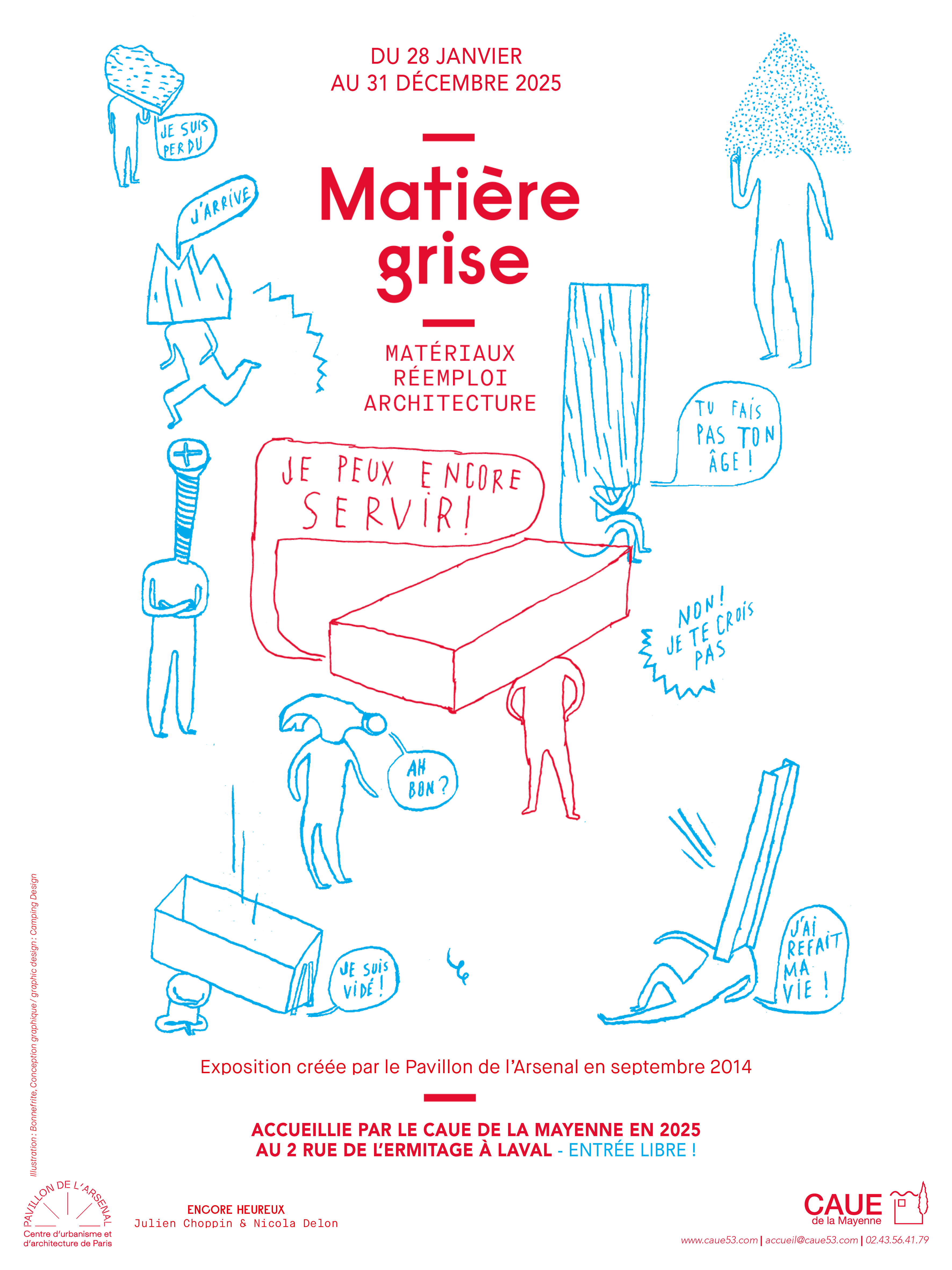 Accueillie en 2025 au sein des locaux du CAUE 53, l’exposition «Matière Grise» a été créée en 2015 par le Pavillon de l’Arsenal et l’agence Encore Heureux architectes, pour témoigner de la frugalité en matériaux dans le secteur de la construction, à l’échelle mondiale.
