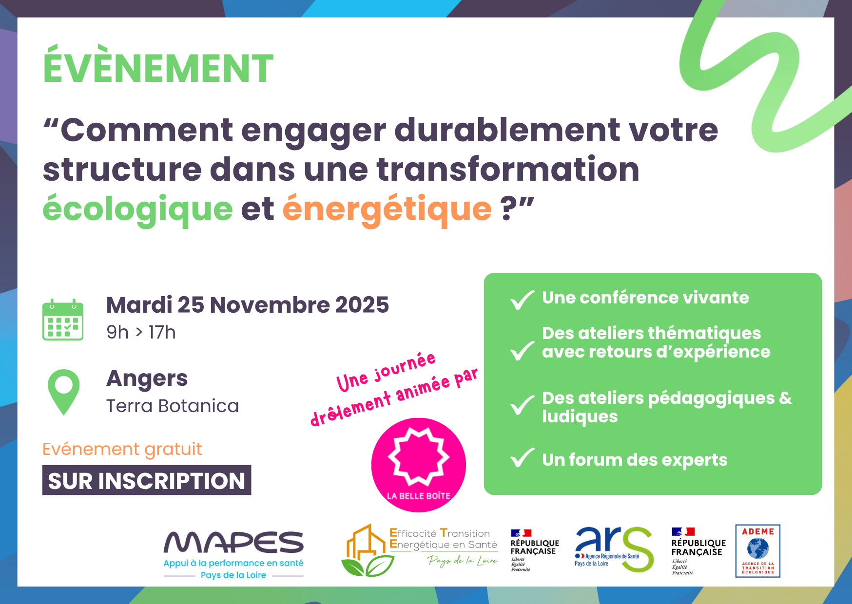La MAPES vous invite à une journée régionale dédiée à la transformation écologique et énergétique des organisations de santé et médico-sociales le mardi 25 Novembre à Terra Botanica à Angers. Une journée dédiée aux établissements sanitaires et médico-sociaux et partenaires qui œuvrent à la transition écologique et énergétique des organisations en Pays de la Loire !